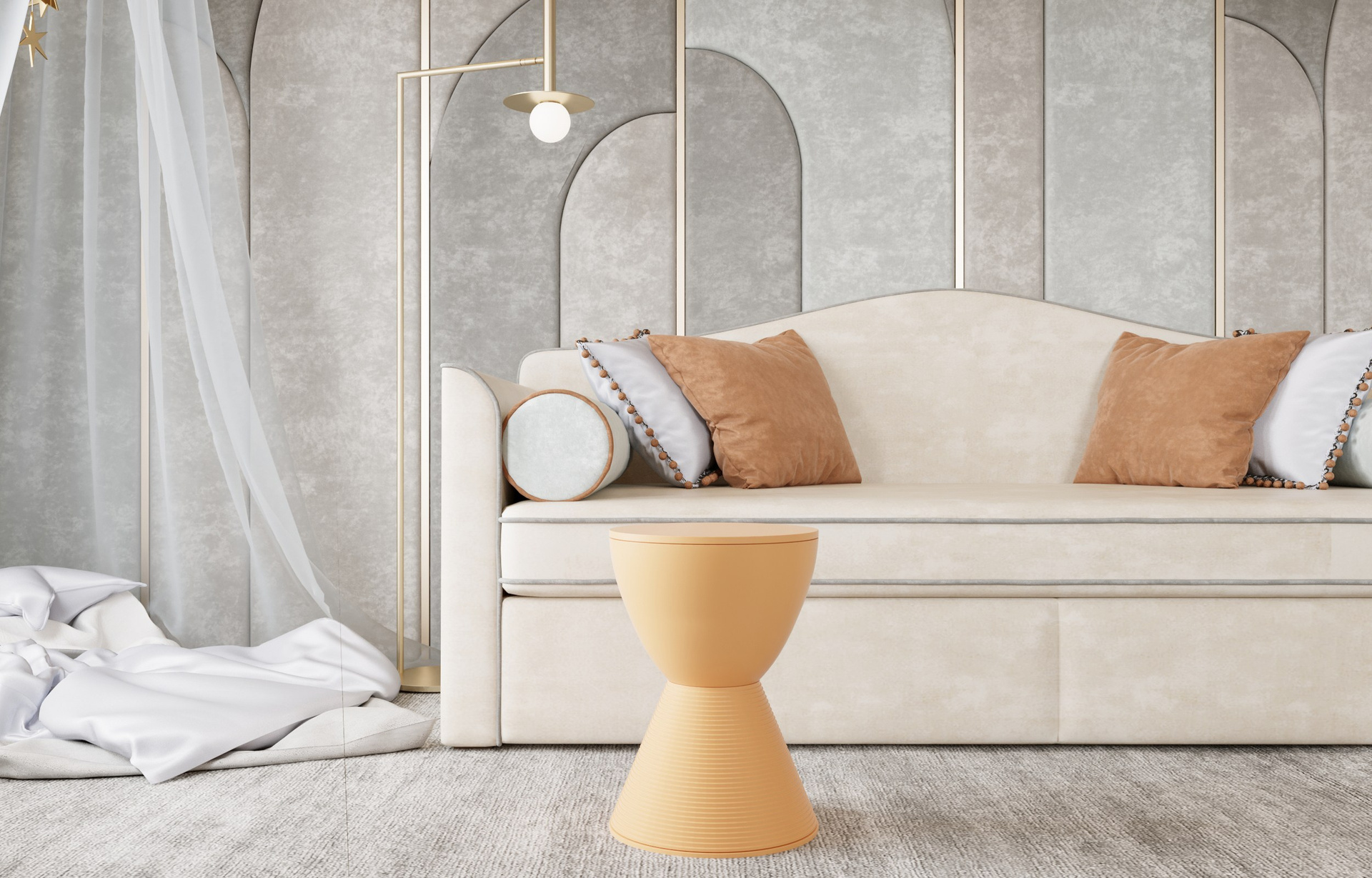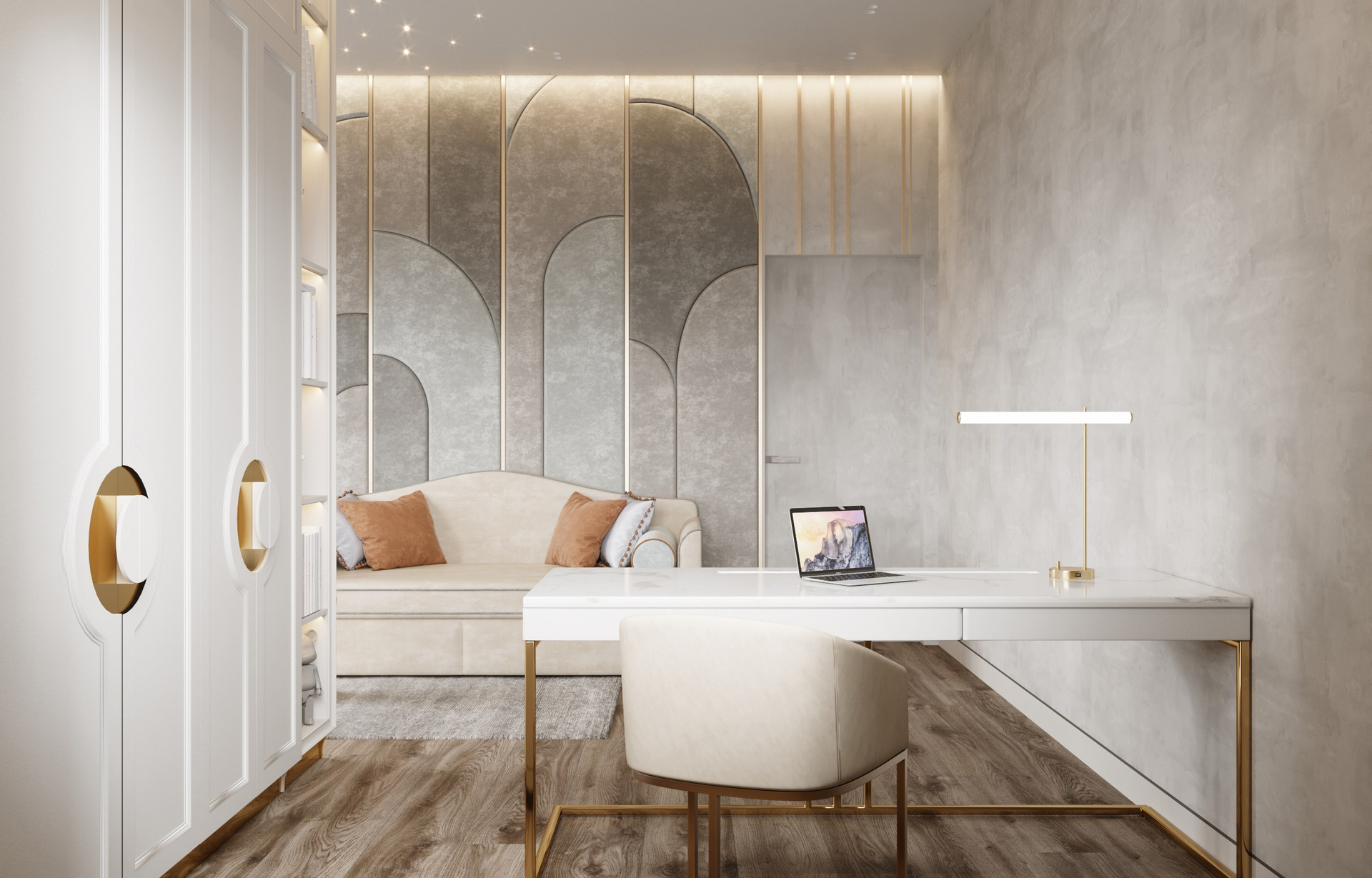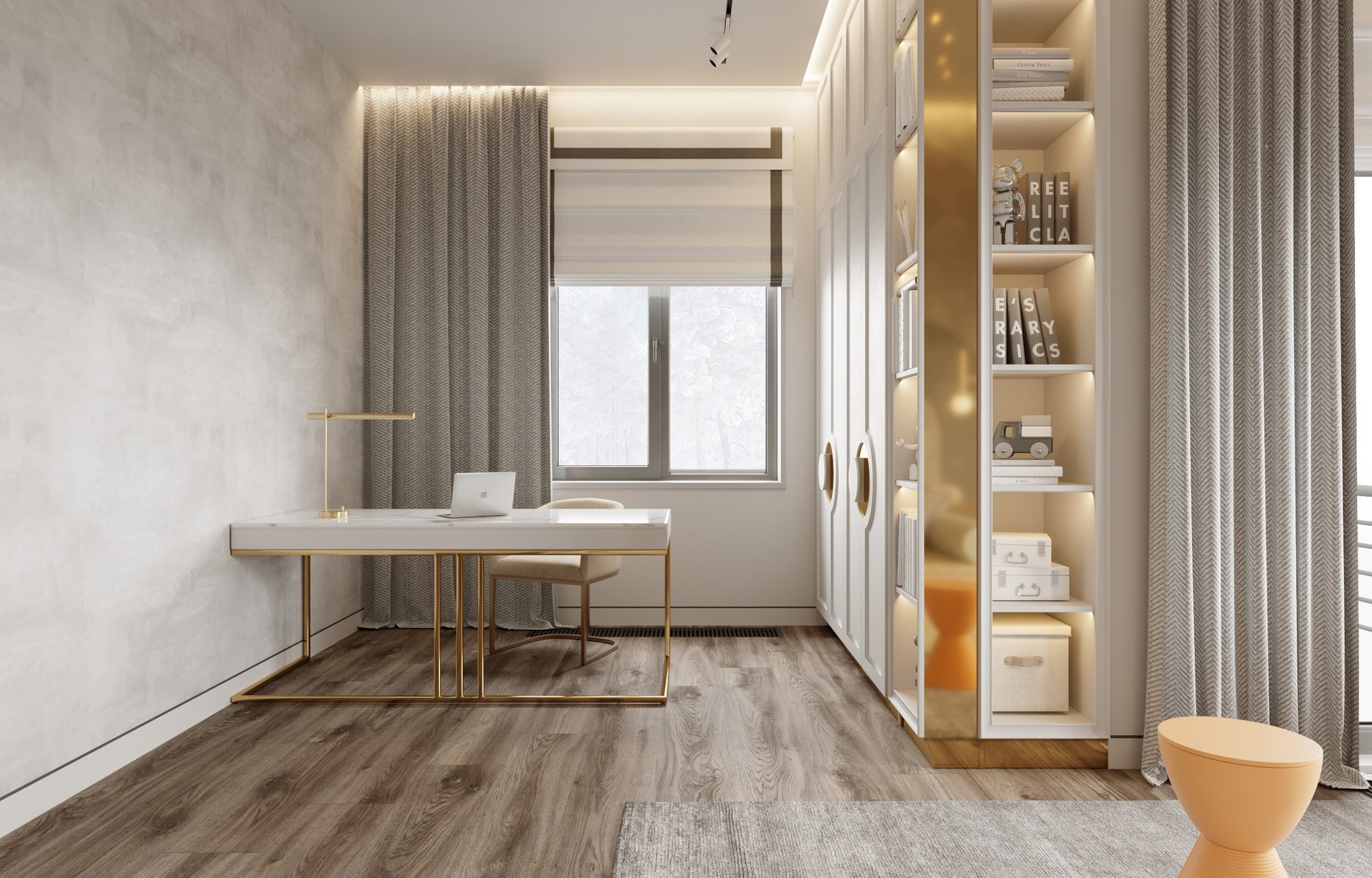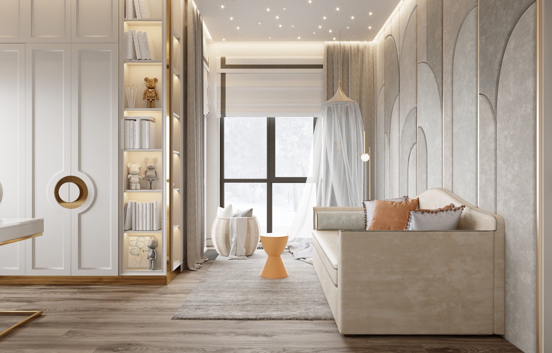 Личные пространства интерьера решены иначе — здесь царит обволакивающая, мягкая палитра, призванная создавать атмосферу спокойствия и уюта. Детская выполнена в серо-голубых тонах, которые дарят ощущение мягкости, безопасности и лёгкости. Спальня словно окутана вуалью: её цветовые решения и плавные переходы оттенков формируют пространство для отдыха и восстановления.