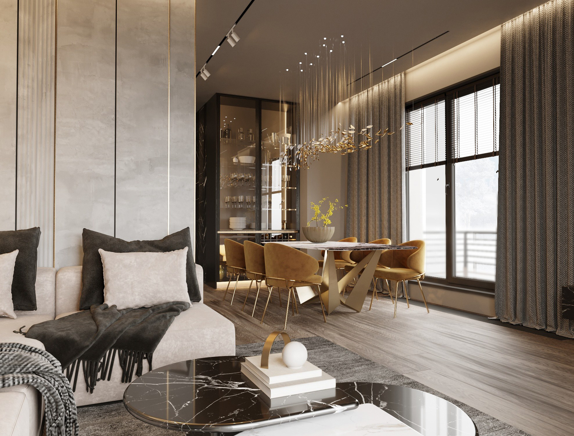 В общественных зонах — гостиной, кухне и прихожей — использованы контрастные цветовые решения. Светлая, мягкая база служит спокойным фоном и усиливает восприятие пространства, а тёмная мебель и декор создают выразительные акценты, формируя современный и динамичный интерьер. Эта палитра делает общие зоны насыщенными, графичными и визуально запоминающимися.